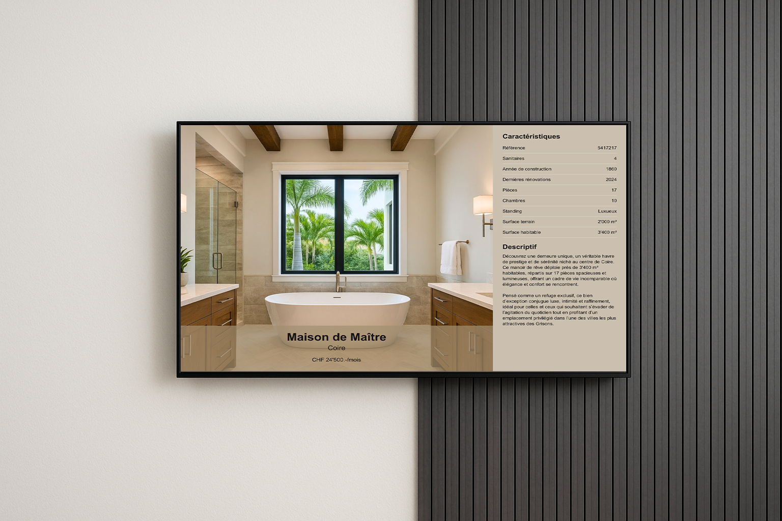 Le Diaporama TV est un module additionnel qui vous permet d’afficher vos biens immobiliers sous forme de présentation visuelle dynamique. Concrètement, vos annonces défilent automatiquement sur un écran, avec les photos et informations que vous avez sélectionnées.